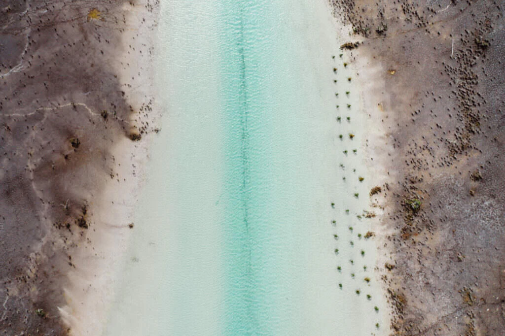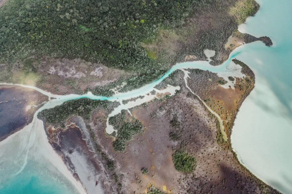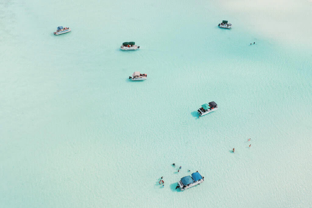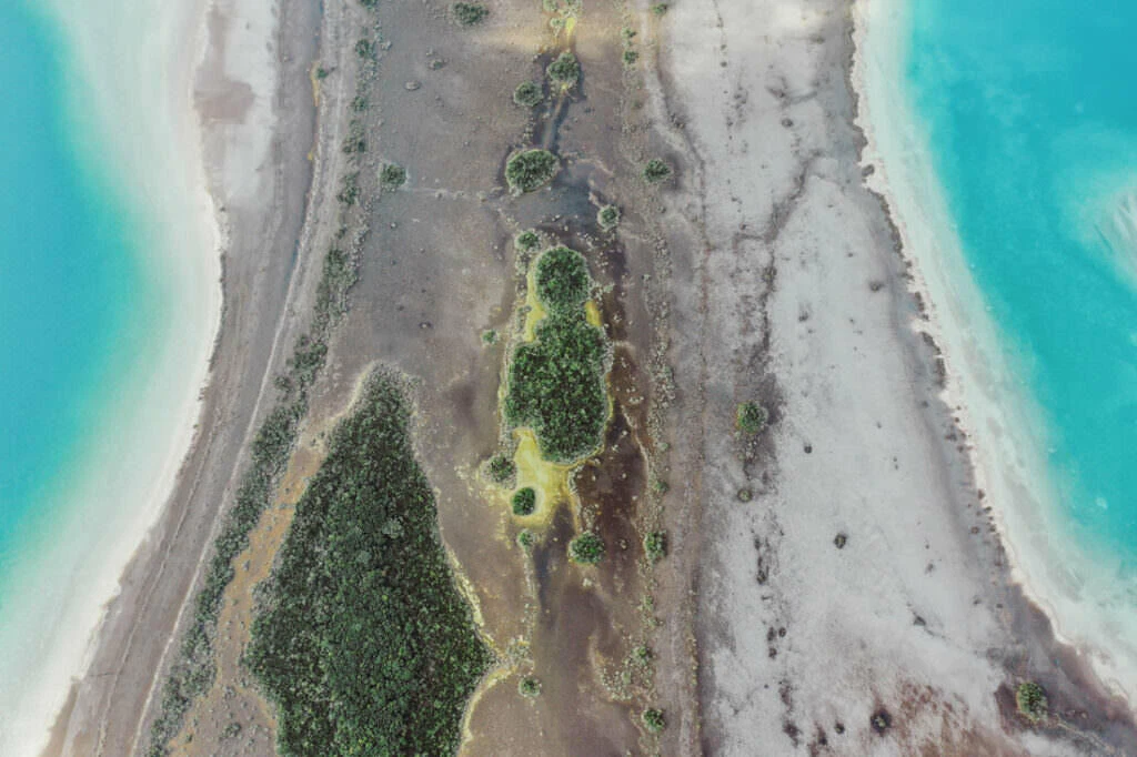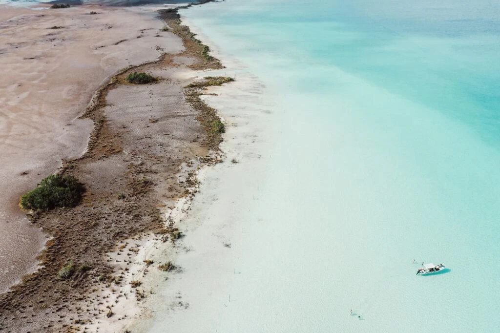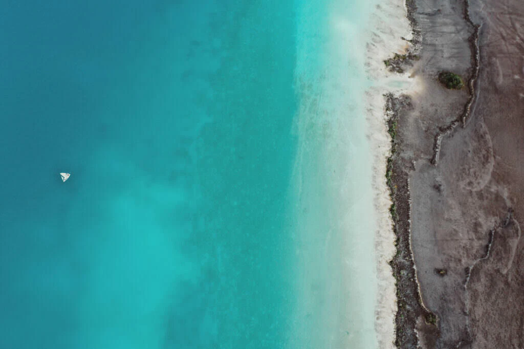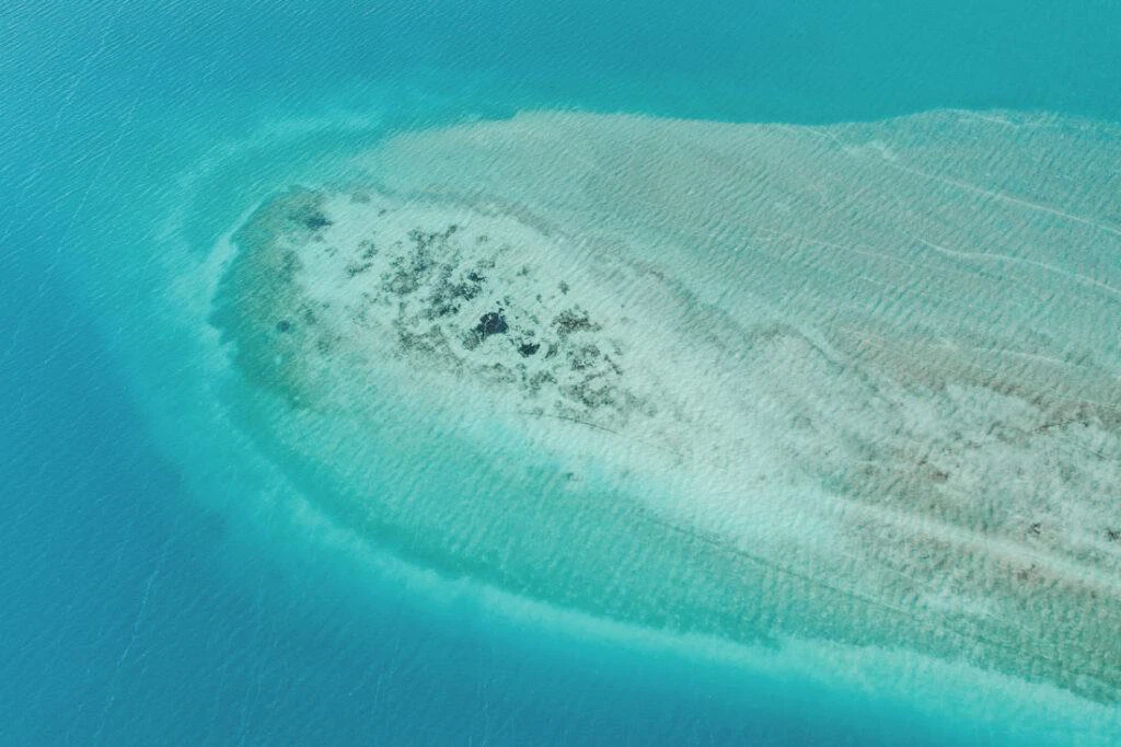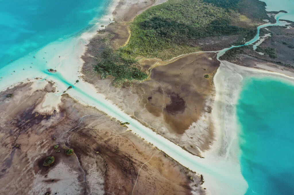 Once a refuge for pirates in the 17th and 18th centuries, the Pirate Bay carries its name proudly. From the air, geological artworks emerge – the deep blue of the lagoon meets the bright white of sandbanks and limestone formations. Mangrove forests stand out like green islands in the turquoise water, a play of depth and light that fascinates.