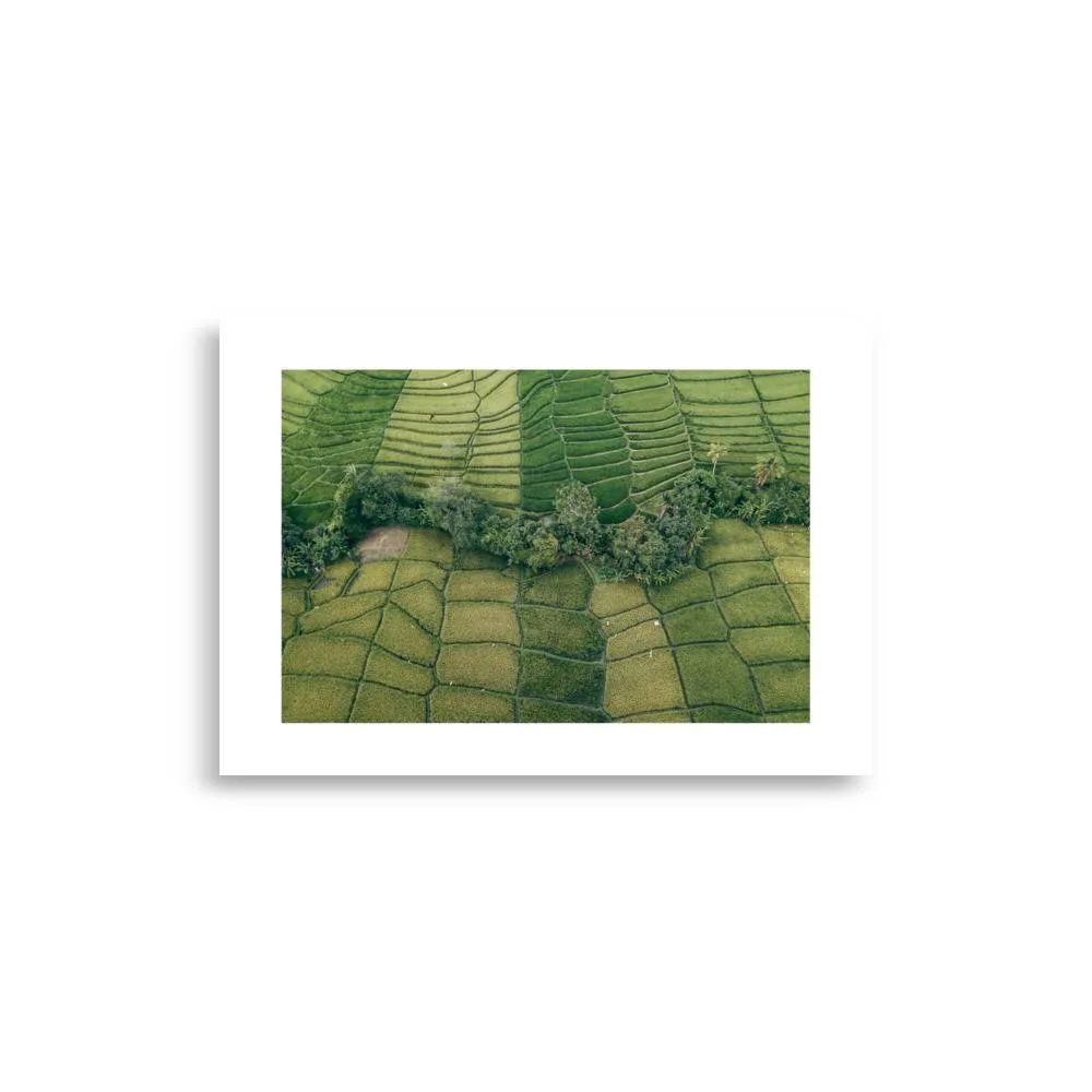 Ein beruhigender Luftblick auf Balis ikonische Reisterrassen, der die filigranen Muster und das saftige Grün dieser atemberaubenden Landschaft zeigt. Das Foto führt in einem langsamen, gleichmäßigen Flug über die Felder und betont die natürlichen Texturen und Schichten dieser berühmten Agrarregion.