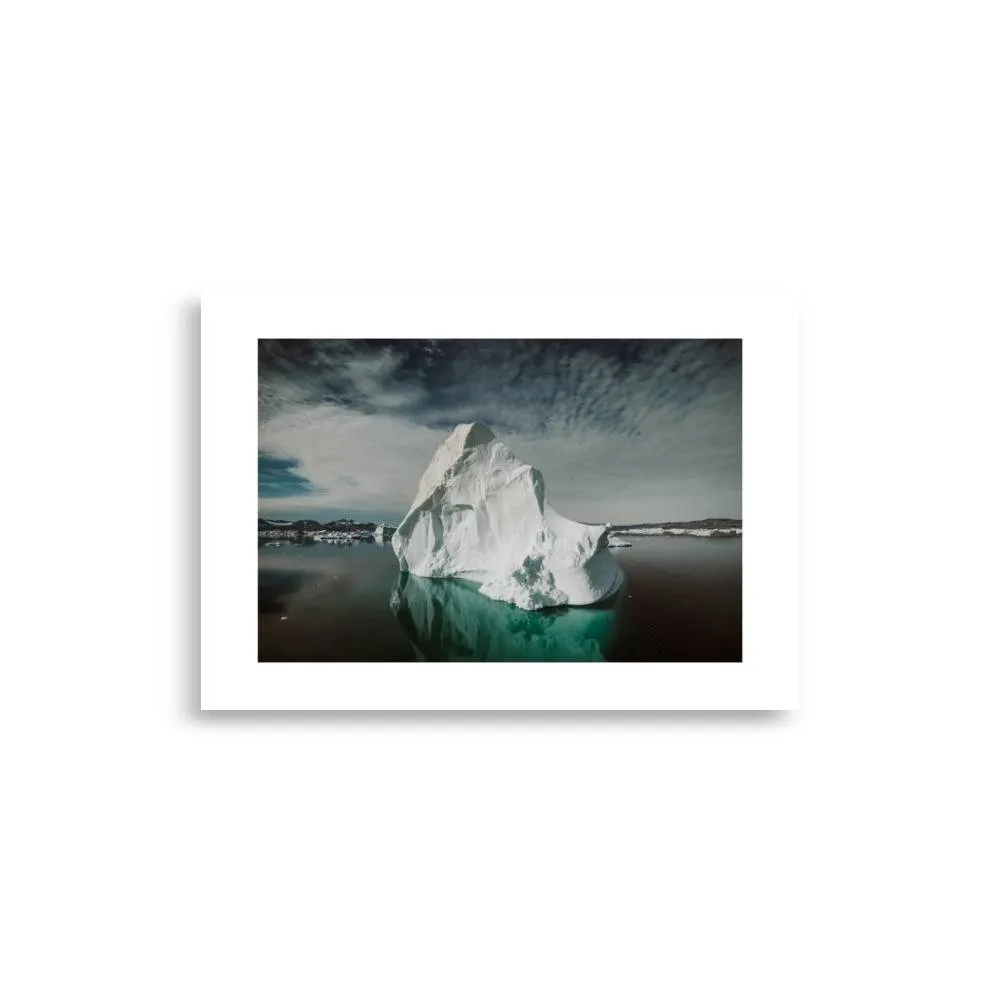 Ein ruhiges Drohnenfoto zeigt einen einsamen, imposanten Eisberg vor Grönlands Küste. Die Drohne kreist sanft um die Formation und offenbart ihre skulpturalen Konturen und zerklüfteten Spitzen. Tealblaues Wasser, sanfte Wellen und reflektiertes Licht lassen die Szene besonders lebendig wirken – ein Blick auf eines der abgelegensten und verletzlichsten Ökosysteme der Erde.