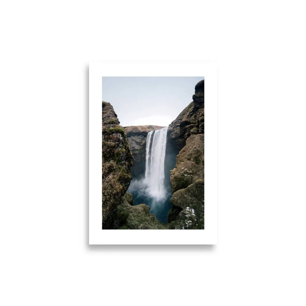 Ein beeindruckendes Foto des ikonischen Skógafoss, der 60 Meter in die Tiefe stürzt. Dichter Nebel steigt aus dem türkisfarbenen Becken auf, während moosbedeckte Klippen die Szene rahmen – pure nordische Kraft und Schönheit.