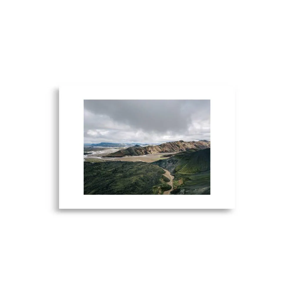 Ein überwältigendes Foto der Landmannalaugar-Region: Bunte Rhyolith-Berge in Braun, Grün und Rot erheben sich unter einem dramatischen Himmel, durchzogen von kleinen Flüssen und moosigen Tälern – eines der schönsten und wildesten Juwelen Islands.