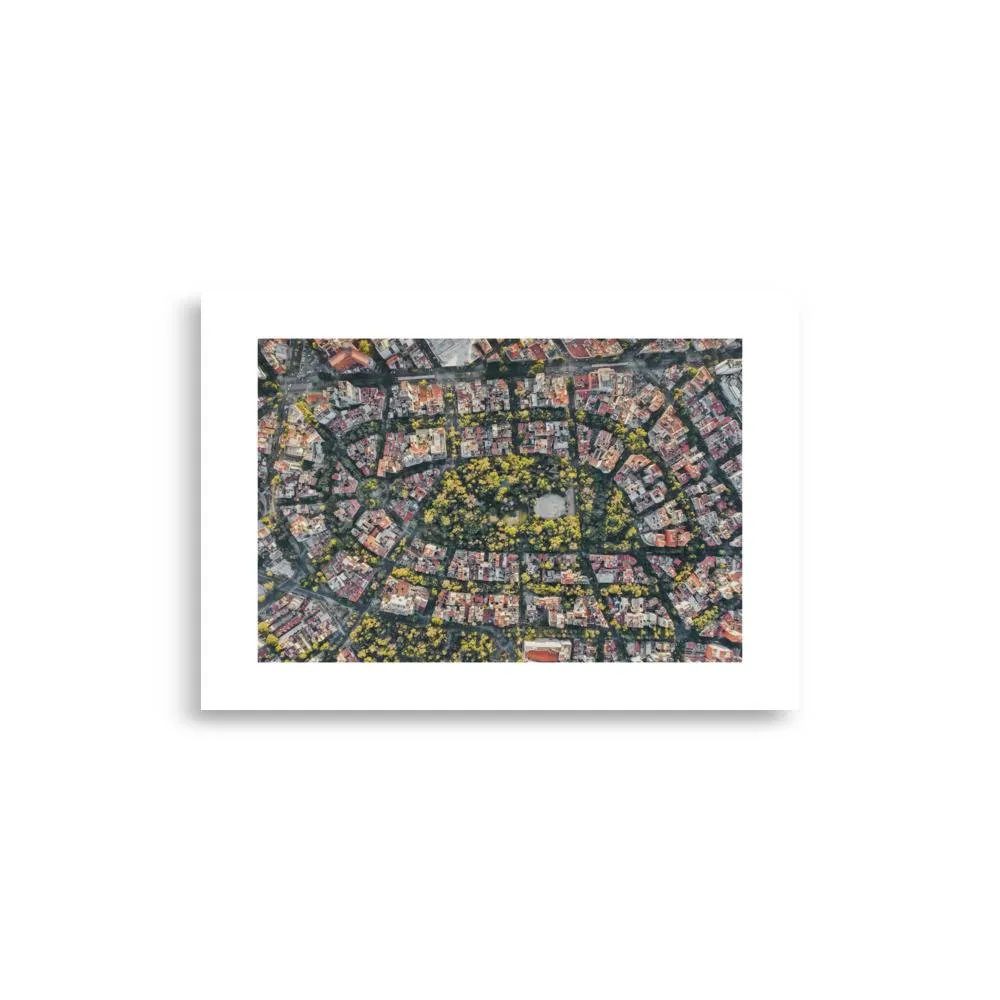 Eine Luftaufnahme, die langsam nach Osten über den ikonischen Ovalpark in Condesa, Mexiko-Stadt, gleitet. Die Kamera hält eine konstante Höhe und zeigt die konzentrischen Straßen mit roten Dächern, die das üppige Blätterdach des Parks einrahmen. Ein leichter Wind bewegt die Baumkronen, während vereinzelt Autos durch das Straßennetz fahren und so dezent städtisches Leben einbringen. In warmem Licht der goldenen Stunde aufgenommen, betont die Szene die harmonische Verbindung von Natur und dichter Architektur des Viertels – ganz ohne Menschen oder Tiere.