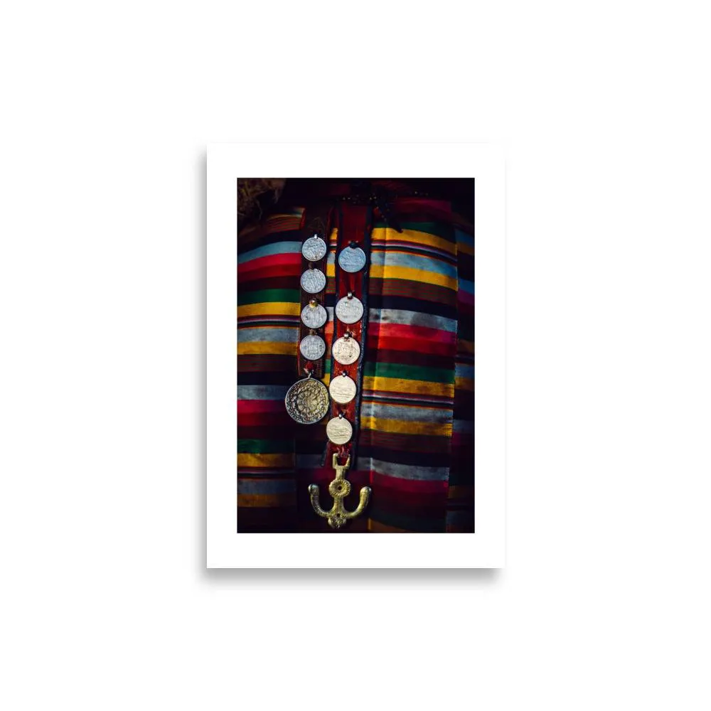 Nahaufnahme traditionellen tibetischen Schmucks auf einem farbenfrohen handgewebten Gürtel. Die kunstvoll gestaltete Metallarbeit zeigt historische Handwerkskunst, mit Silbermünzen und einem goldenen Verschluss, die einen schönen Kontrast zu dem lebhaften gestreiften Textil bilden. Das Stück spiegelt das reiche kulturelle Erbe Tibets und sein künstlerisches Vermächtnis wider.