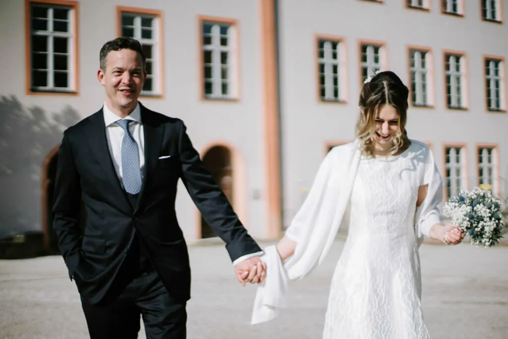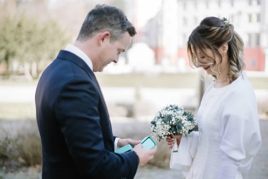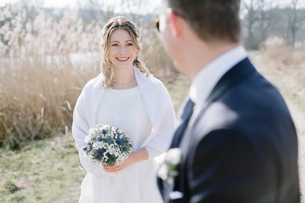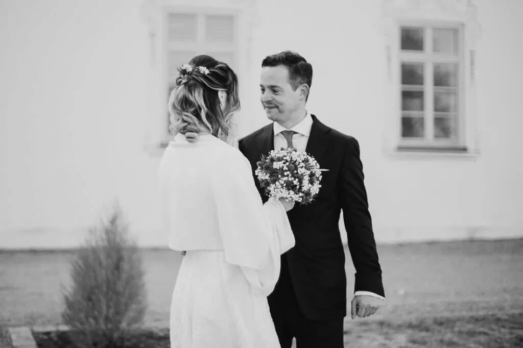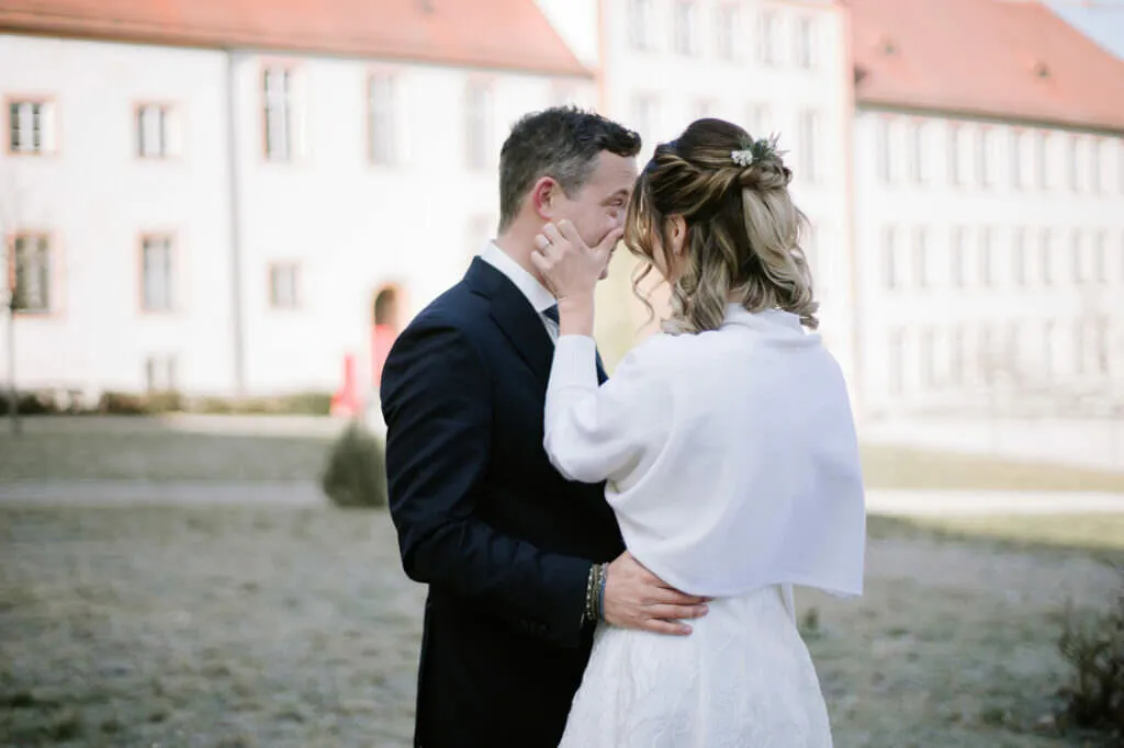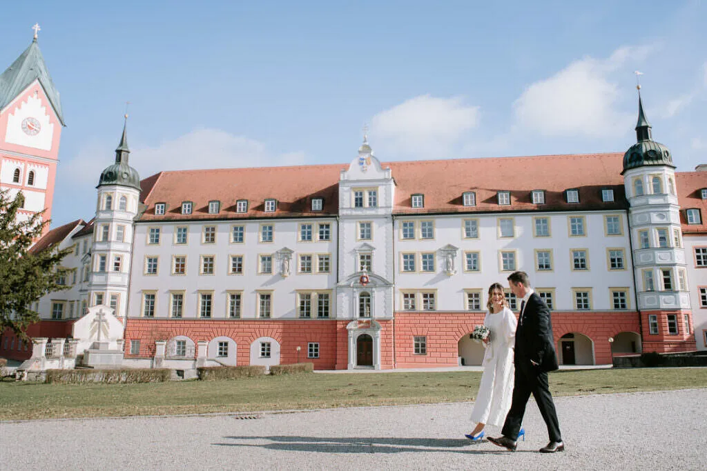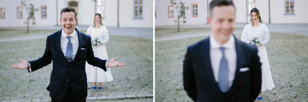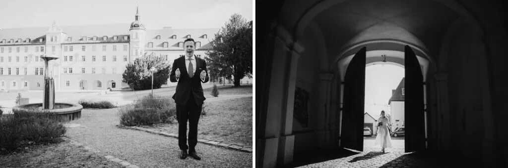 Es war ein besonderer und emotionaler Moment, als die Beiden sich zum ersten Mal sahen. Nur Vogelgezwitscher und eine wunderschöne Lichtstimmung im leeren Innenhof des Klosters, wow! Nach ein paar Bildern im Innenhof ging es ein paar Meter weiter zur nächsten Location, dem wunderschönen Prielhof und ein paar angrenzenden Weihern. Wir hatten schon viel Spaß hier beim Shooting und hätten noch lange weiterfotografieren können, aber natürlich warteten auf uns die vielen Freunde und Familienmitglieder zur standesamtlichen Trauung im Rathaus von Pfaffenhofen. Die Trauung wurde vom Bürgermeister sehr persönlich und schön gestaltet.