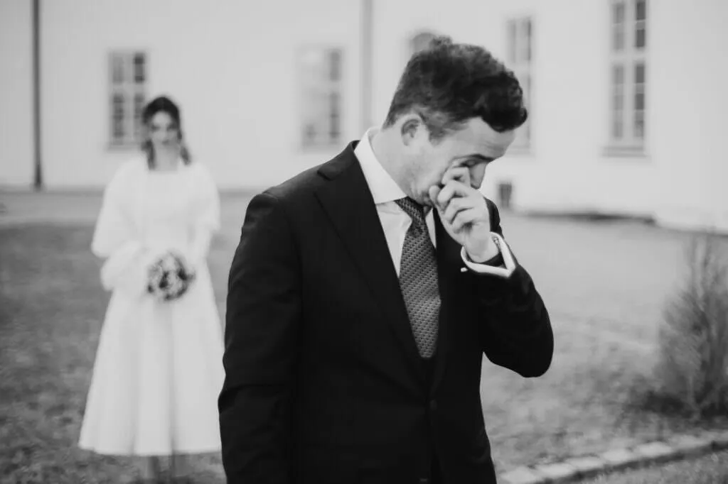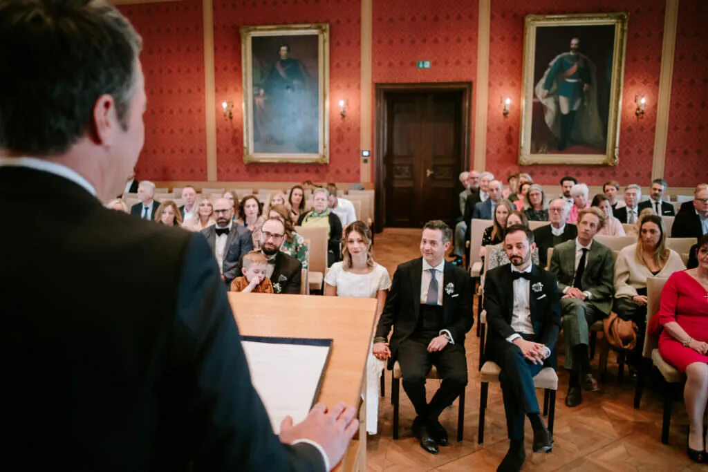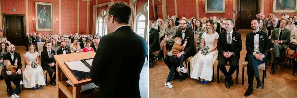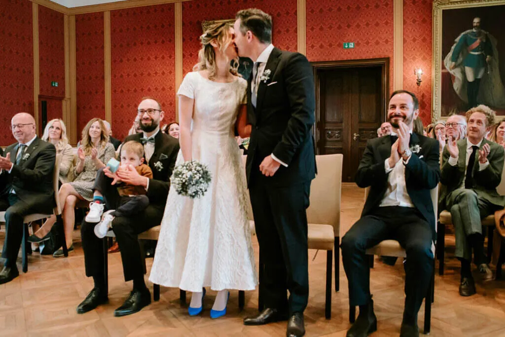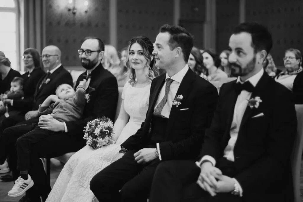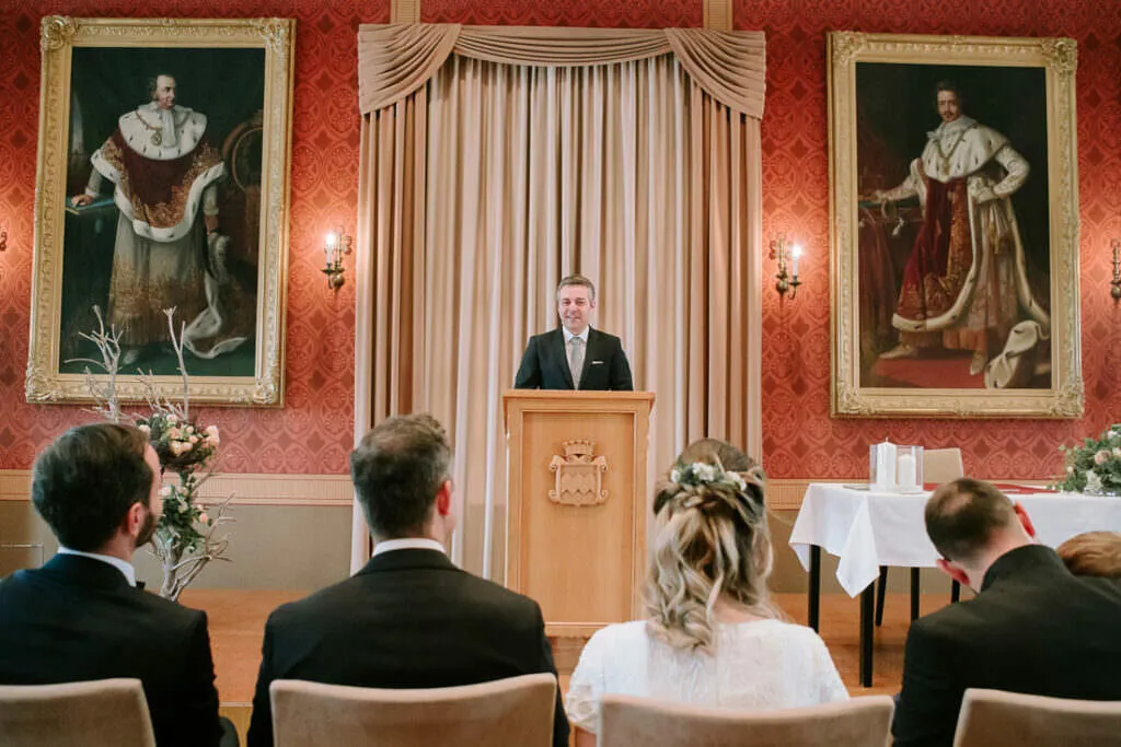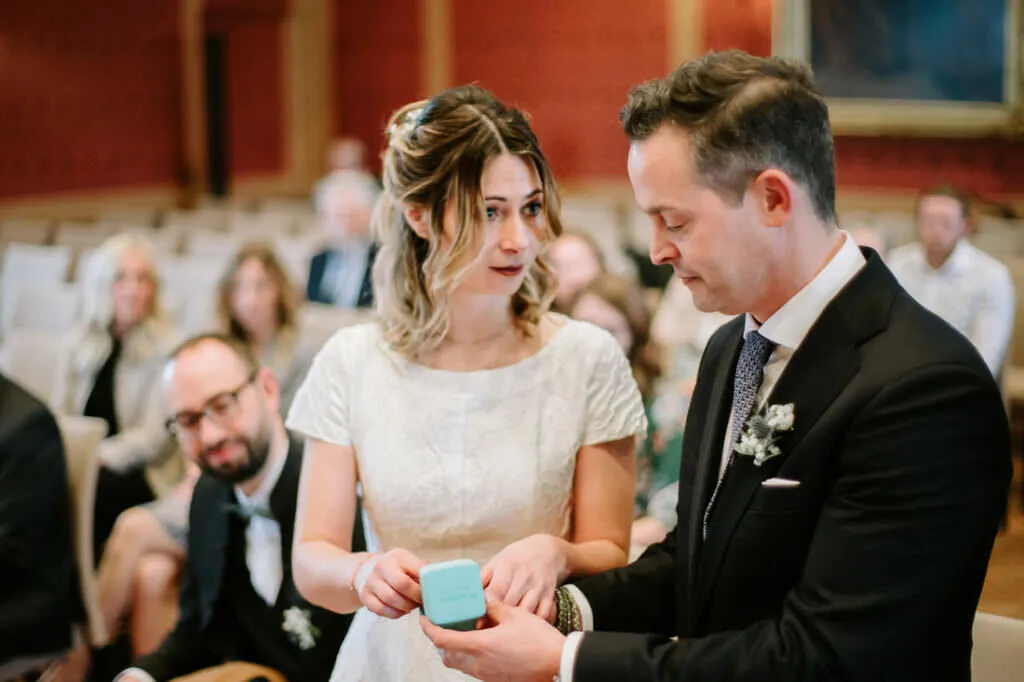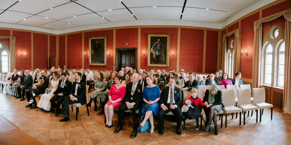 Es war ein besonderer und emotionaler Moment, als die Beiden sich zum ersten Mal sahen. Nur Vogelgezwitscher und eine wunderschöne Lichtstimmung im leeren Innenhof des Klosters, wow! Nach ein paar Bildern im Innenhof ging es ein paar Meter weiter zur nächsten Location, dem wunderschönen Prielhof und ein paar angrenzenden Weihern. Wir hatten schon viel Spaß hier beim Shooting und hätten noch lange weiterfotografieren können, aber natürlich warteten auf uns die vielen Freunde und Familienmitglieder zur standesamtlichen Trauung im Rathaus von Pfaffenhofen. Die Trauung wurde vom Bürgermeister sehr persönlich und schön gestaltet.