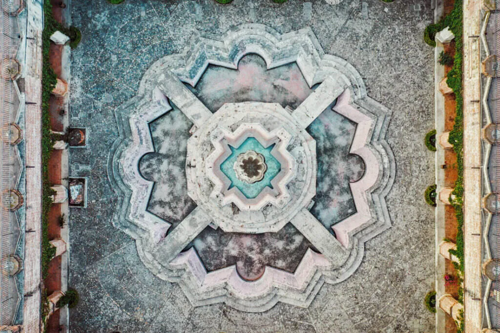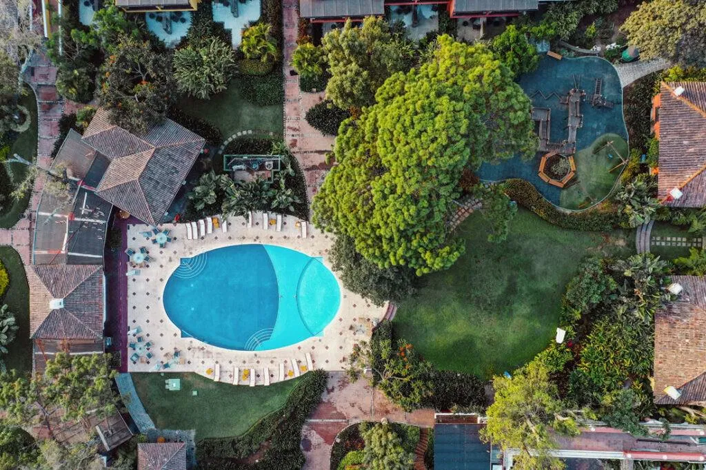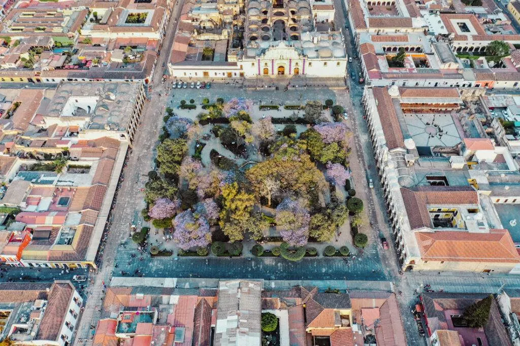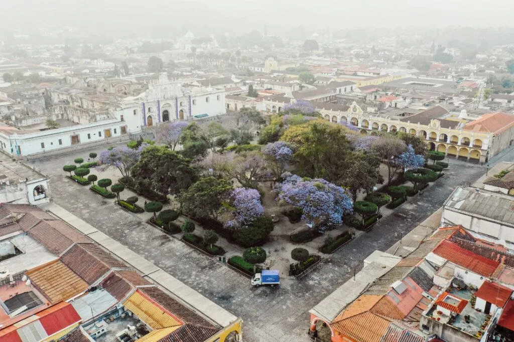 En las tomas aéreas, el Parque Central brilla con calma, rodeado de joyas históricas como el Palacio de los Capitanes Generales y la Catedral de Antigua. Estas construcciones, dispuestas en armonía, hablan de una historia larga y viva, de un legado que aún respira en piedra y color. El trazado de la ciudad transmite paz, pero los detalles susurran vida.