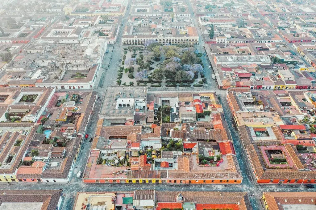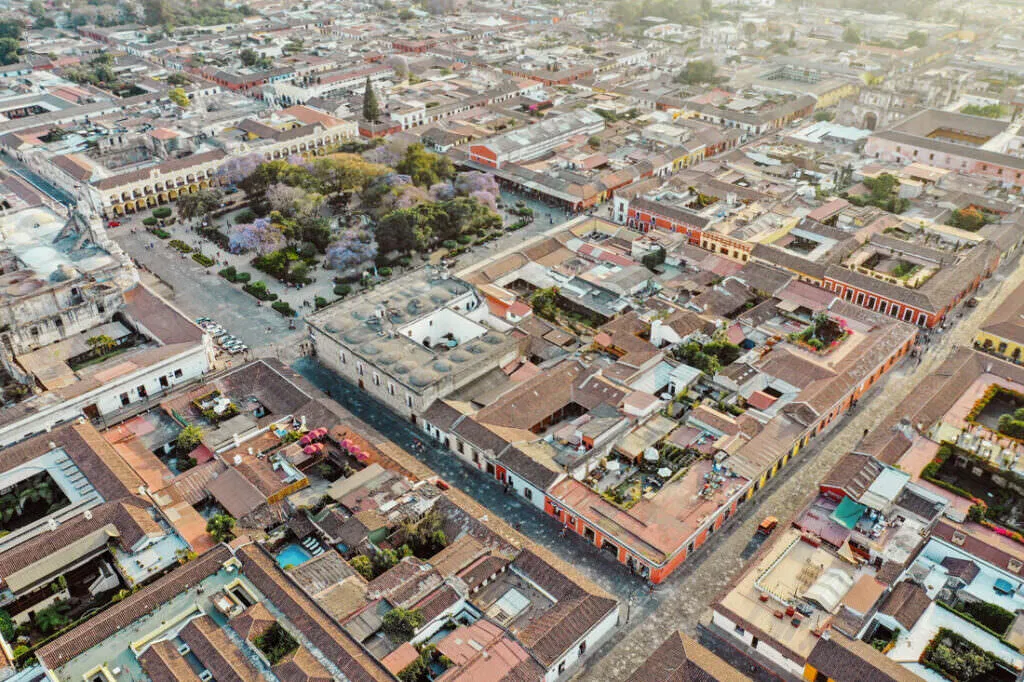 Antigua, en lo alto del altiplano guatemalteco, me atrapó desde el primer momento. Una ciudad donde las calles empedradas y las construcciones coloniales dibujan, vistas desde el cielo, un mosaico ordenado. Casas coloridas, iglesias antiguas y plazas llenas de vida bailan bajo mis ojos – un contraste entre pasado y pulso.