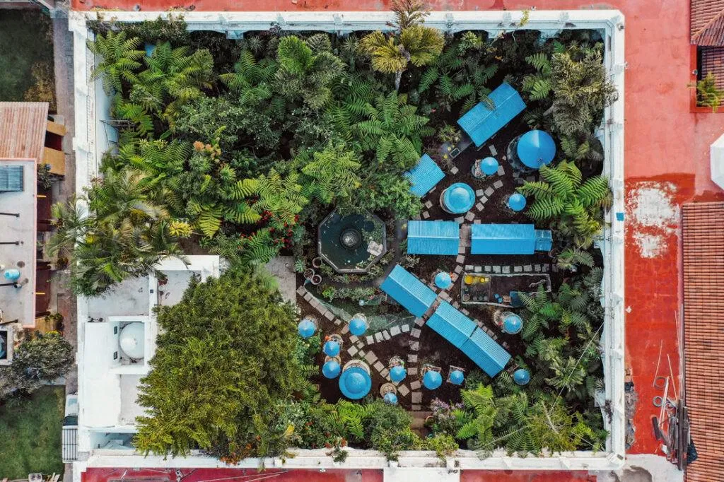 Lo que cautiva la mirada son los volcanes que rodean Antigua, en especial el volcán de Agua, que se alza majestuoso en el horizonte. Desde las alturas, parece un guardián en silencio, cuyas laderas verdes dialogan con los tejados rojos y las fachadas en tonos pastel. Un paisaje tan áspero como delicado, que abre el corazón con solo mirarlo.