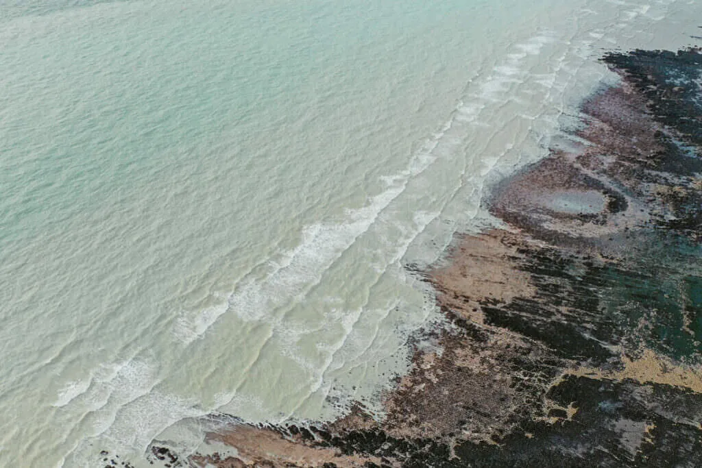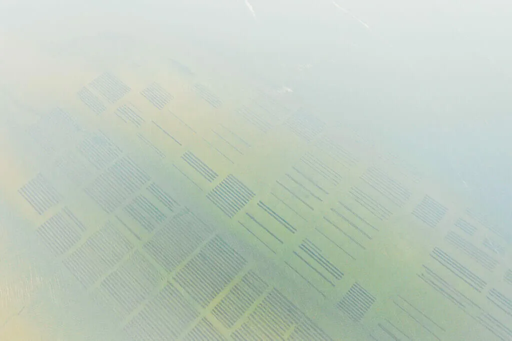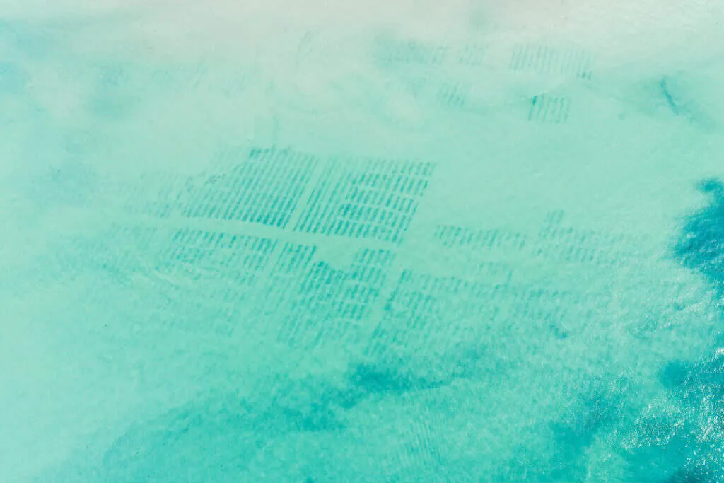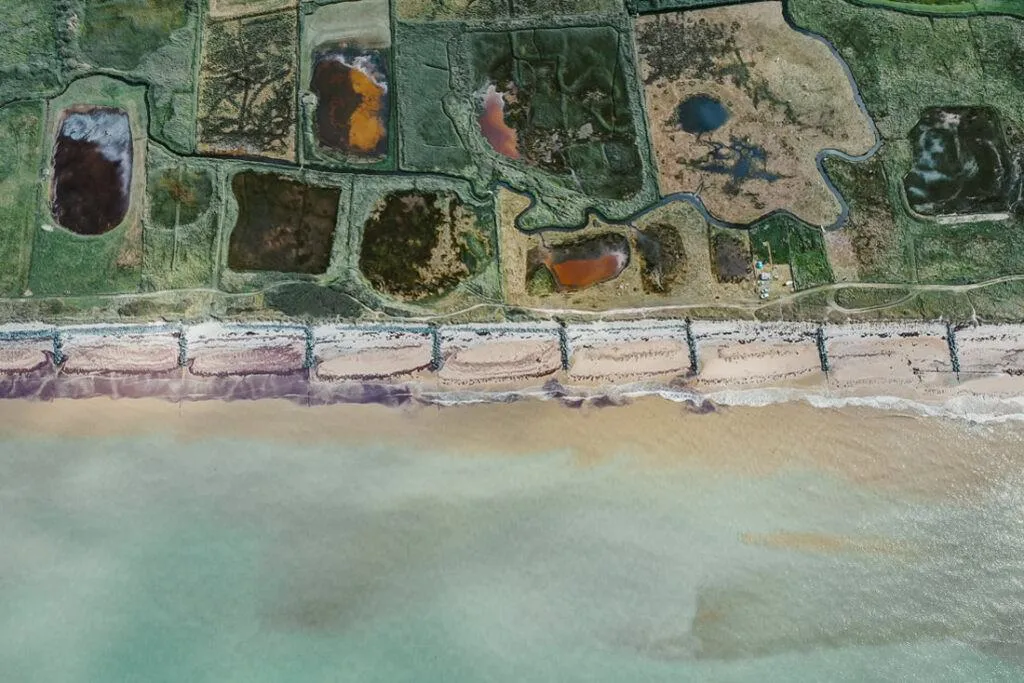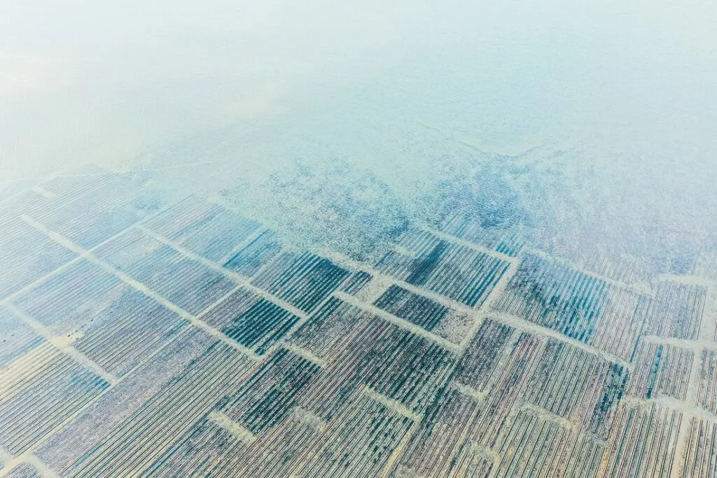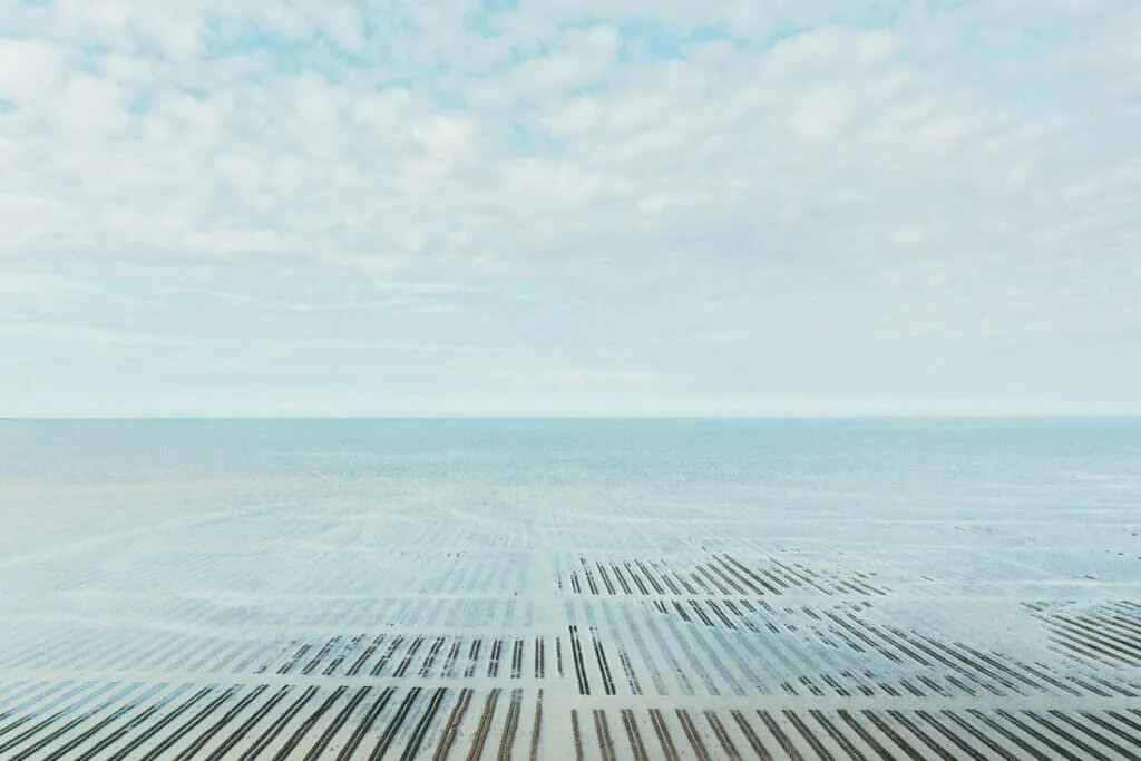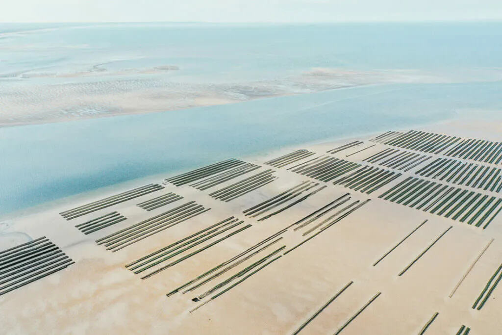 A lo largo de la costa, brillan las granjas de ostras, un espectáculo que cambia con las mareas – a veces abiertas, a veces sumergidas, un juego entre agua y tierra. Desde las alturas, estas vistas fascinantes revelan cómo el mar hace bailar las estructuras – entre claridad y caos, un paisaje que atrapa la mirada.