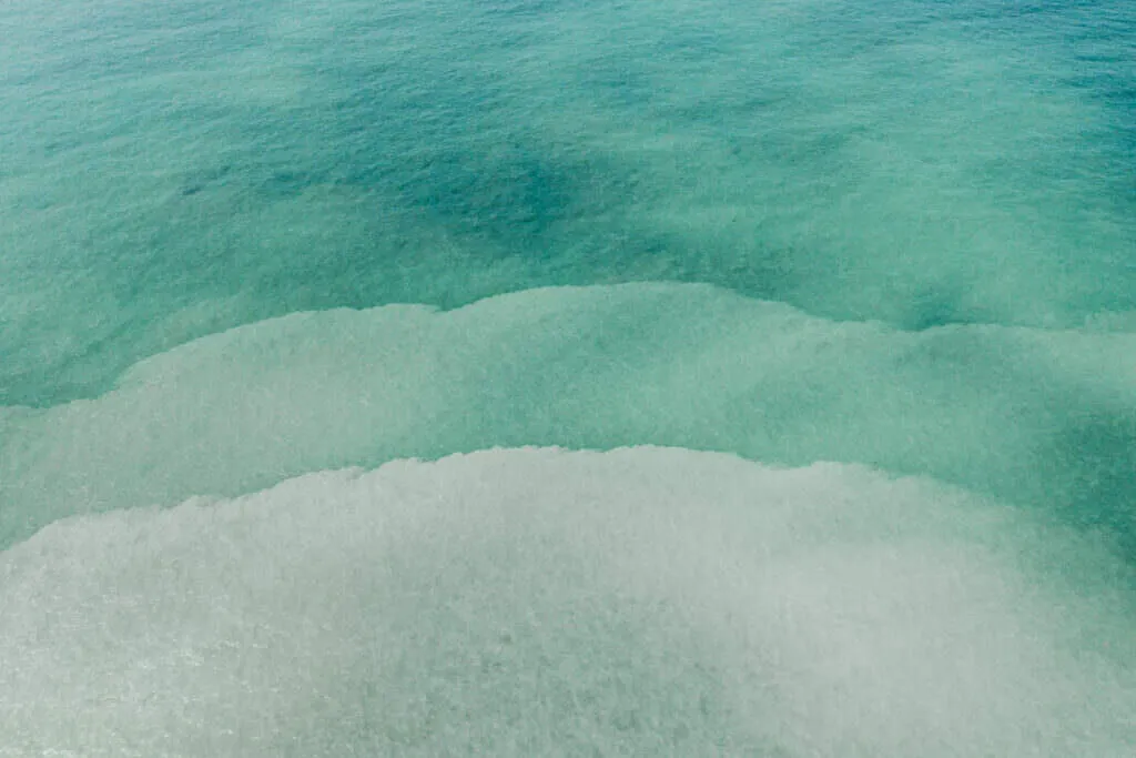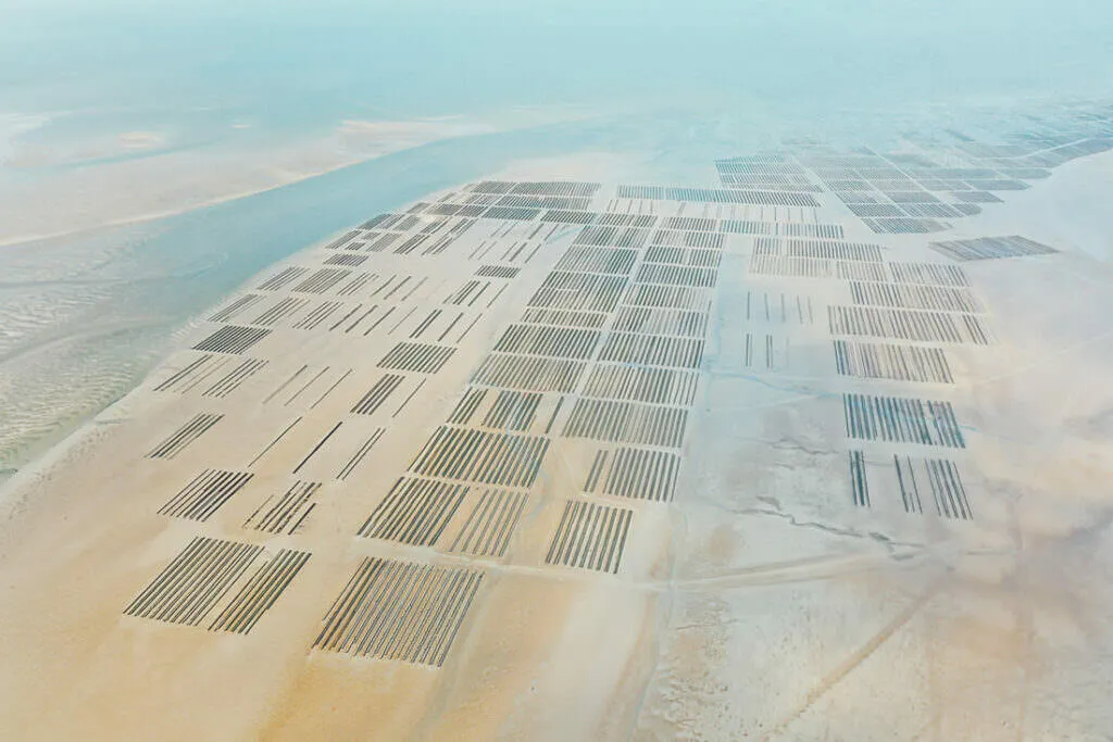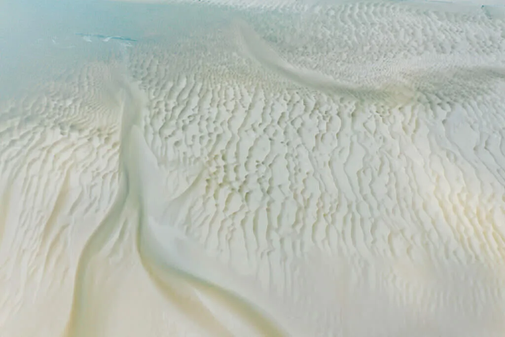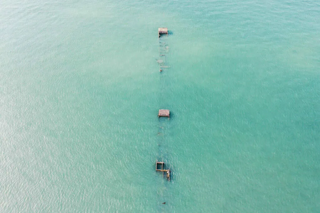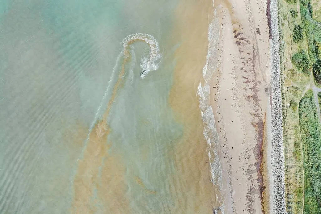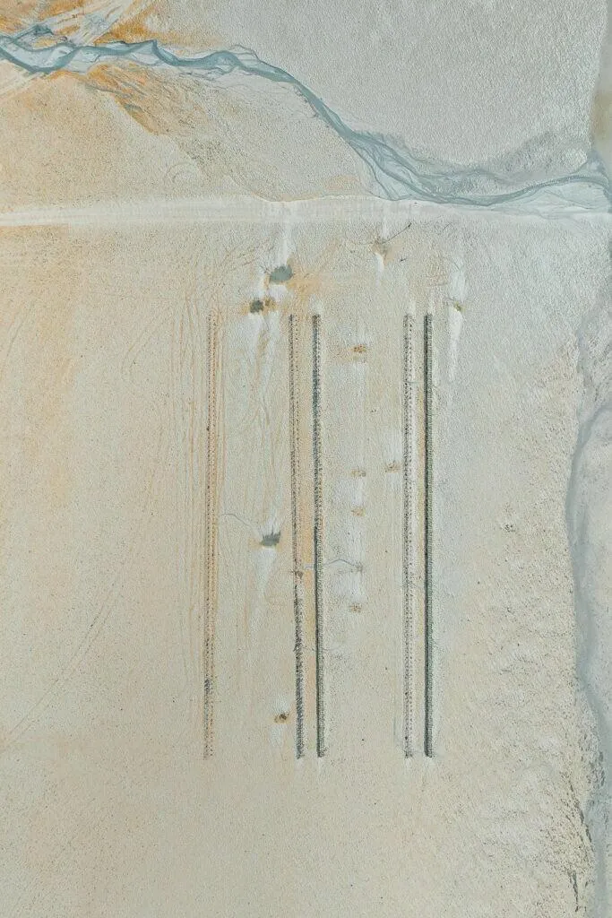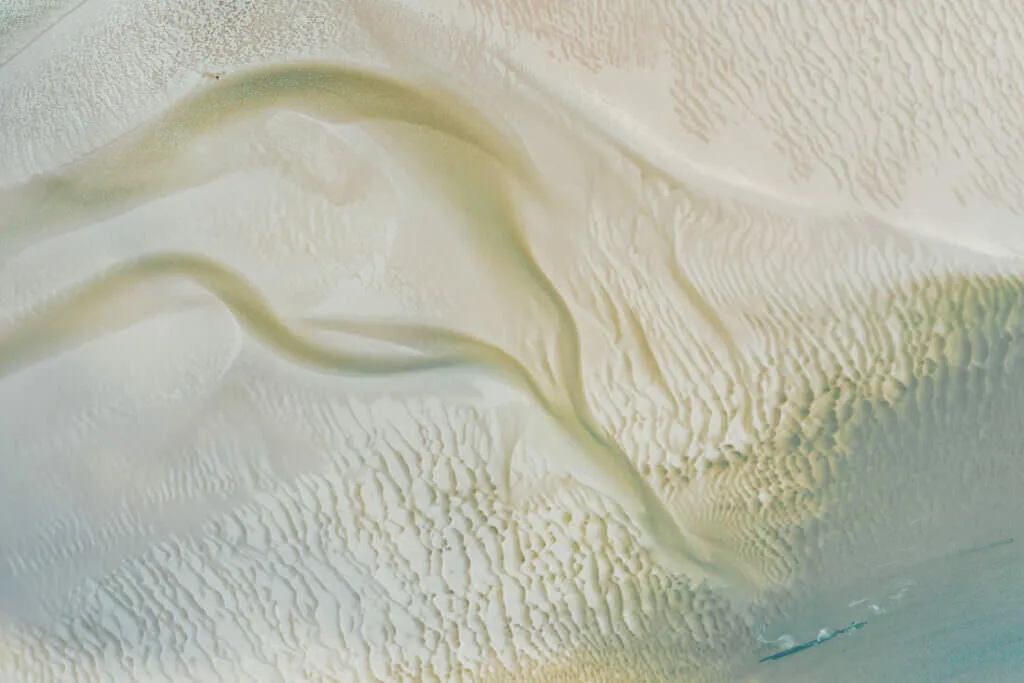 A lo largo de la costa, brillan las granjas de ostras, un espectáculo que cambia con las mareas – a veces abiertas, a veces sumergidas, un juego entre agua y tierra. Desde las alturas, estas vistas fascinantes revelan cómo el mar hace bailar las estructuras – entre claridad y caos, un paisaje que atrapa la mirada.