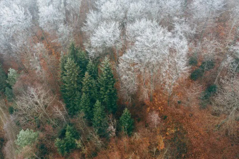 Von oben zeigte sich der Wald in voller Pracht – gefrorene Baumspitzen glitzerten, Nebelschwaden schwebten knapp darüber, ein Kontrast zwischen Kälte und Leichtigkeit, rau und zart. Am Boden streuten alte Blätter Farbtupfer ein, ein Tanz zwischen Frost und Herbst, der die Fotos lebendig machte.