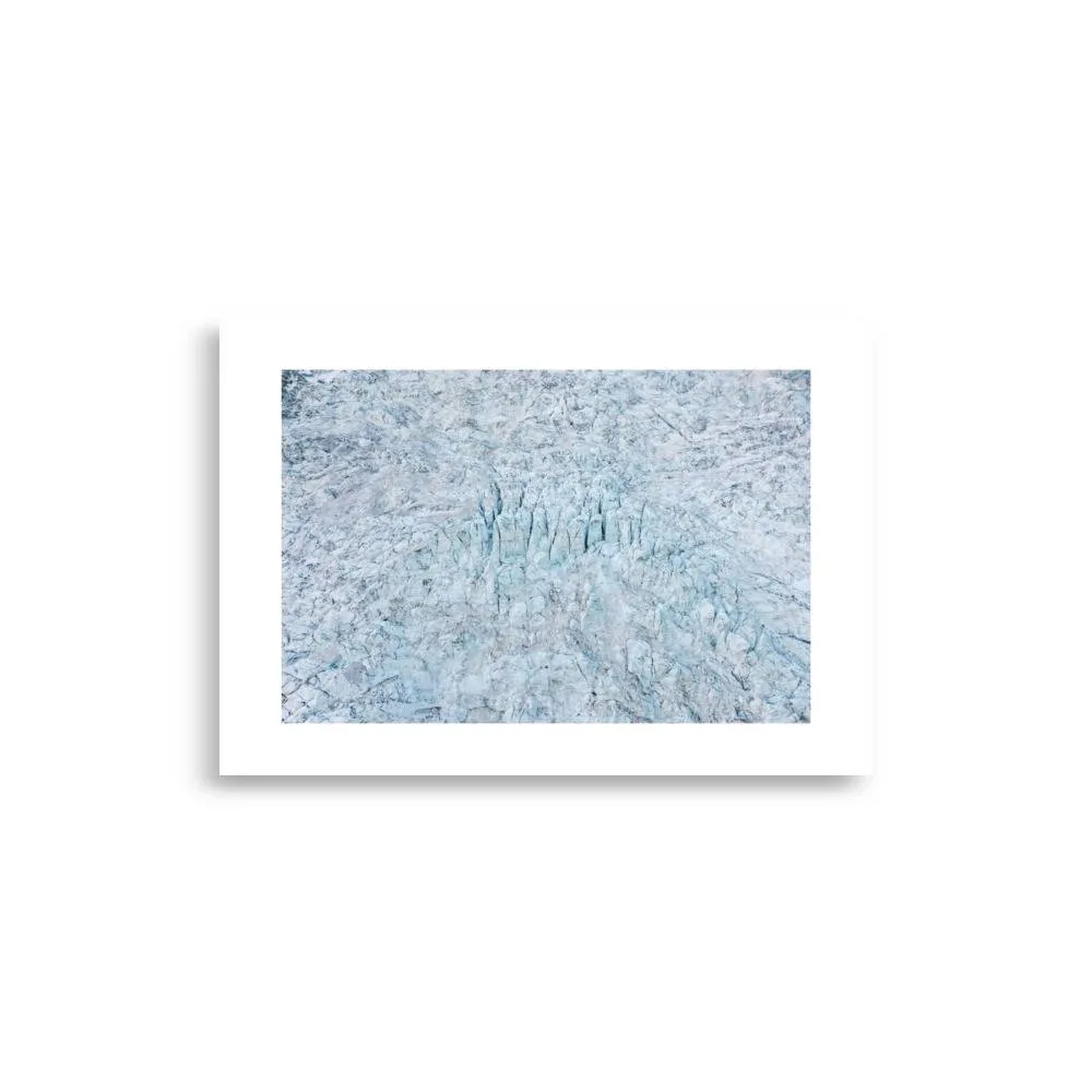 Erleben Sie die unberührte Schönheit des Mont-Blanc-Gletschers von oben. Diese Luftaufnahme zeigt den Gletscher in bemerkenswertem Detail und betont seine komplexe Eisstruktur sowie die rauen Texturen. Das Foto hebt die natürliche Anziehungskraft der Szene hervor, ohne Farbveränderungen, und bewahrt die authentischen Weiß- und Blautöne dieses alpinen Wunders.